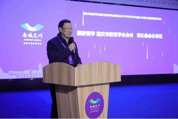 国家督学、重庆市教育学会会长邓沁泉作总结讲话。他充分肯定美术教育专委会过去一年工作扎实、活动务实、成果厚实,美术教育专委会自成立以来,始终牢记习近平总书记"做好美育工作,弘扬中华美育精神"的重要指示,始终锚定《关于全面加强和改进新时代学校美育工作的意见》要求,紧扣重庆"以美育人、以文化人,打造西部美育高地"的发展目标,以中小学美术教育为核心阵地,交出了一份兼具专业性与影响力的亮眼答卷。从第一次会员代表大会确立规范架构,到多层次学术研讨深化教学实践,再到国际交流打开视野格局,专委会已然成为凝聚全市美术教育力量、推动事业高质量发展的坚实桥梁。要求专委会一是要锚定核心素养,打造中小学美术教学"提质引擎"。要紧扣美术学科核心素养培育目标,深度对接新课标要求,把审美感知、艺术表现、创意实践、文化理解的培育贯穿教学全过程。开展专题教研和课例攻关,打造一批可复制、可推广的重庆样板课。二是要深挖本土资源,筑牢中小学美术教育"文化根基"。要牵头搭建本土资源转化平台,组织专家和一线教师共同研发校本课程,推动本土艺术资源与国家课程、地方课程有机融合,让中小学生在美术学习中读懂巴渝文化、增强文化自信。三是要建强专业梯队,激活中小学美术教育"内生动力"。要聚焦中小学教师专业成长需求,构建分层分类培养体系,深入推进校园美育浸润行动计划的实施与落地,加强与高校、艺术机构的联动,引入优质资源为教师成长赋能,打造一支政治过硬、专业精湛、充满活力的重庆中小学美术教师队伍。