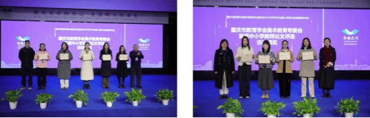 重庆市教育委员会体艺卫处处长程翔宇、四川美术学院艺术教育学院党总支部书记付继红、重庆市教育科学研究院基础教育教学研究所副所长张咏梅、巴南区教师进修学院副院长刘玉霞共同为首届中小学美术教师论文评选获奖人员颁发荣誉证书,激励全市美术教师深耕教研、提升专业素养。